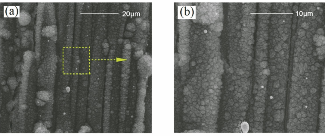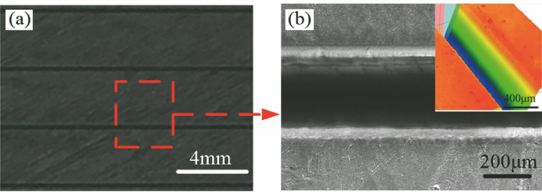 為了控制CMC-SiC中由激光熱作用導(dǎo)致的加工缺陷利用超短脈沖激光對(duì)CMC-SiC 進(jìn)行精密加工成為國內(nèi)外學(xué)者研究的熱點(diǎn)。蔡敏等對(duì)比了納秒激光和皮秒激光的SiC/SiC加工效果,結(jié)果表明:納秒激光加工過程中材料表面同樣存在熱影響區(qū),導(dǎo)致激光輻照區(qū)域產(chǎn)生了重鑄層、分層及微裂紋等缺陷;利用皮秒激光加工,相對(duì)納秒激光,SiC/SiC的加工質(zhì)量有顯著提高,激光輻照區(qū)域未發(fā)現(xiàn)熱影響區(qū),即重鑄層、分層、微裂紋等缺陷在皮秒激光加工中得到了有效抑制。Liu等利用皮秒激光開展了C/SiC的微孔加工實(shí)驗(yàn),研究發(fā)現(xiàn):當(dāng)激光功率密度較低時(shí),孔內(nèi)形成的反沖氣壓同樣較低,導(dǎo)致孔內(nèi)碎屑不能有效噴出;升高激光功率密度后,加工過程中孔內(nèi)產(chǎn)生強(qiáng)烈的沖擊波,形成的反沖高壓使得碎屑從孔內(nèi)高速向外噴射,微孔加工質(zhì)量明顯提高。Moreno等開展了飛秒激光加工纖維增強(qiáng)復(fù)合材料的實(shí)驗(yàn)研究,發(fā)現(xiàn)內(nèi)部基體材料的尺寸和形狀對(duì)激光加工質(zhì)量存在較大影響。在飛秒激光參數(shù)的合理調(diào)控下,纖維增強(qiáng)復(fù)合材料獲得了良好的加工質(zhì)量。Zhai等在SiC/SiC上利用飛秒激光進(jìn)行了多種微結(jié)構(gòu)的制備研究,檢測報(bào)告顯示SiC/SiC加工區(qū)域輪廓清晰,沒有出現(xiàn)機(jī)械加工常見的崩邊、纖維拔出,以及長脈沖激光加工中明顯的熱影響區(qū)。為了驗(yàn)證加工效果,利用飛秒激光在SiC/SiC表面制備了大面積的微槽結(jié)構(gòu),加工效果如圖8所示。