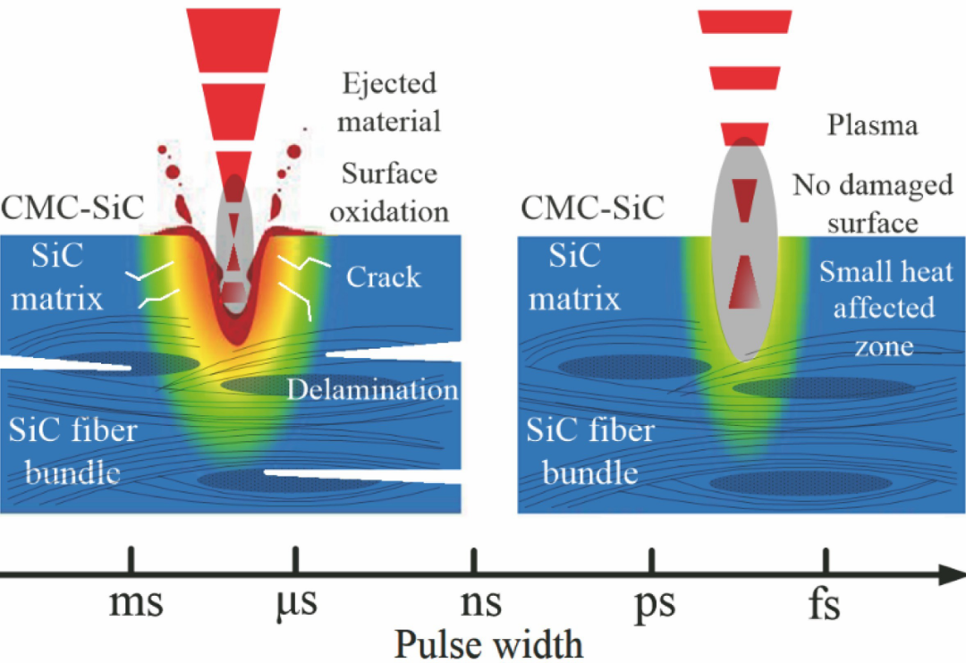 脈沖寬度是影響激光束與材料相互作用的重要因素,脈沖激光包括長脈沖激光(>100 ns)、短脈沖激光(10 ps~100 ns)及超短脈沖激光(<10 ps),不同脈寬激光與CMC-SiC的作用機(jī)理如圖9所示。連續(xù)激光及大功率長脈沖激光作用下,CMC-SiC的材料去除主要依靠熱累積所引起的熔化與氣化;納秒激光屬于短脈沖激光,在CMC-SiC加工中產(chǎn)生的熱作用相對(duì)較小,CMC-SiC的刻蝕過程中包含光熱與光化學(xué)兩種作用;皮秒及飛秒激光的脈沖寬度極短,CMC-SiC表面刻蝕中幾乎不存在熱作用。在光化學(xué)作用下,材料連續(xù)吸收光子能量后發(fā)生電離,產(chǎn)生的等離子體高速噴射而出,CMC-SiC的材料去除通過相爆炸、庫倫爆炸、光子機(jī)械破損等效應(yīng)的耦合作用完成。因此,超短脈沖激光憑借脈沖持續(xù)時(shí)間短、峰值功率密度高的特性,可用于實(shí)現(xiàn)CMC-SiC的非熱熔性冷加工。