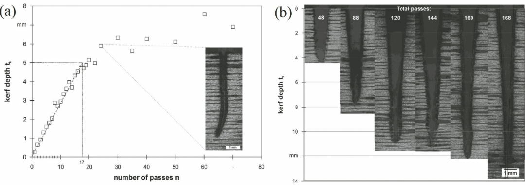 圖10 激光切割效果對(duì)比:(a)焦點(diǎn)固定式切割;(b)焦點(diǎn)平移配合進(jìn)給式切割